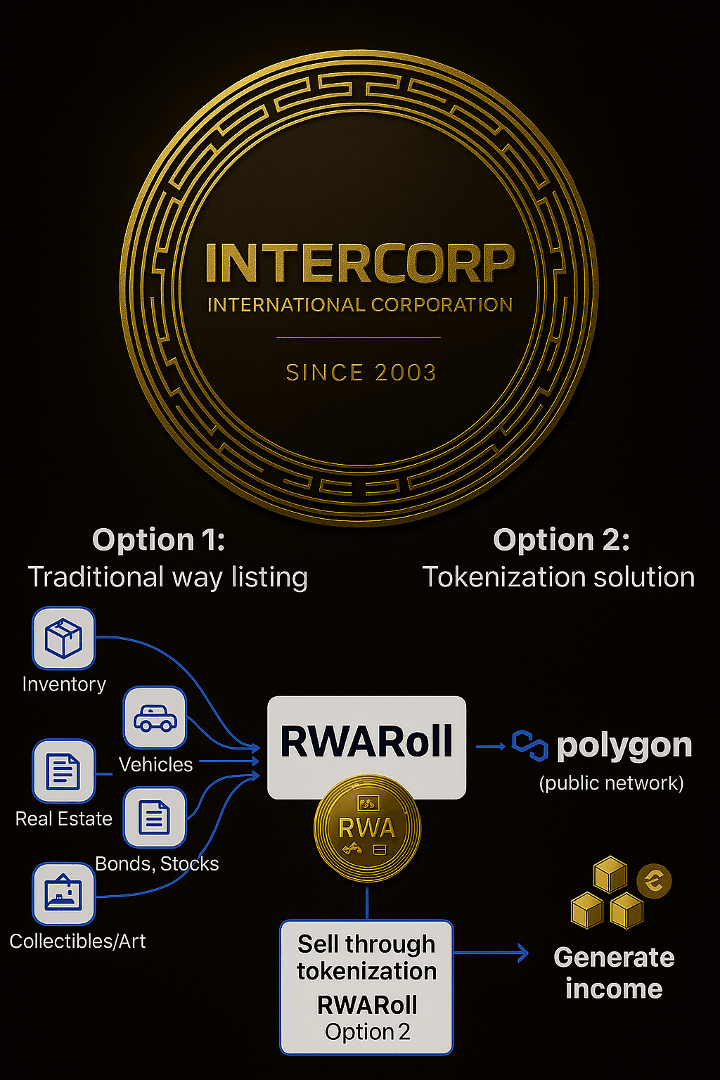 Intercorp Holdings S.A. is a joint-stock company operating in Romania, primarily focused on the holding and strategic management of diverse assets. The company is currently engaged in the development and implementation of a hybrid digital asset and e-commerce infrastructure project, aligned with its long-term business strategy. This initiative is a technical and operational development that integrates two distinct platforms: Listezz.com: A traditional online marketplace for general sales activities. A new digital solution: RWARoll - proprietary platform that utilizes blockchain technology to explore multi-asset digital representation and management, initially within the local market, with a roadmap for potential future expansion across Europe and internationally.